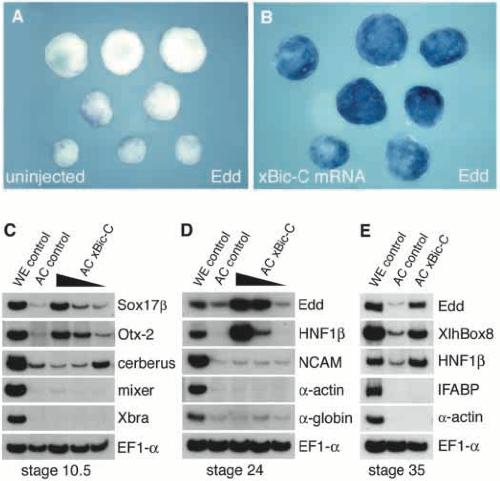 The Xenopus homologue of Bicaudal-C is a localized maternal mRNA that can induce endoderm formation. , Wessely O , De Robertis EM ., Development. May 1, 2000; 127 (10): 2053-62.