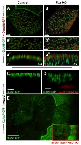 The planar cell polarity effector Fuz is essential for targeted membrane trafficking, ciliogenesis and mouse embryonic development., Gray RS, Abitua PB, Wlodarczyk BJ, Szabo-Rogers HL, Blanchard O, Lee I, Weiss GS, Liu KJ, Marcotte EM, Wallingford JB, Finnell RH., Nat Cell Biol. October 1, 2009; 11 (10): 1225-32. |