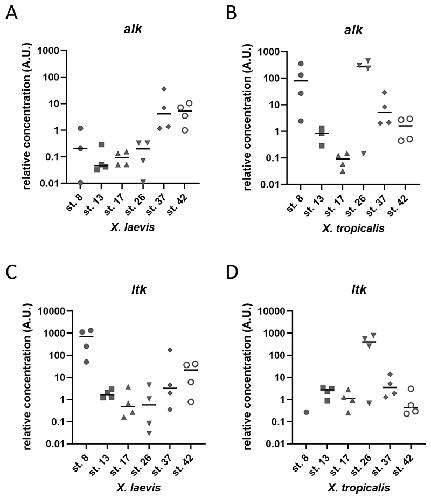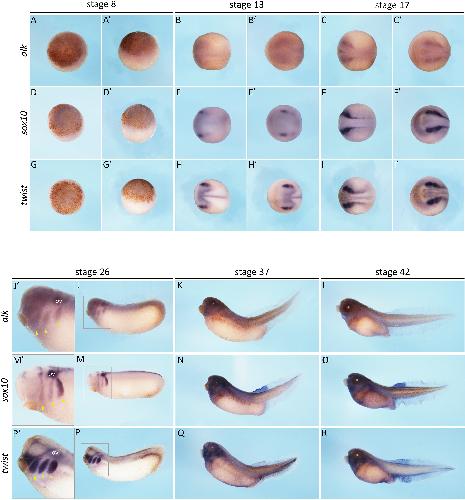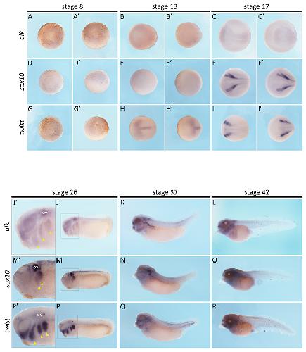 Anaplastic lymphoma kinase (alk), a neuroblastoma associated gene, is expressed in neural crest domains during embryonic development of Xenopus., Moreno MM, Barrell WB, Godwin A, Guille M, Liu KJ., Gene Expr Patterns. June 19, 2021; 40 119183. |