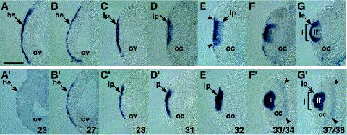 | ectoderm eye head lens lens fiber cell mass lens placode photoreceptor layer retina retinal neural layer retinal outer nuclear layer sensorial layer whole organism |