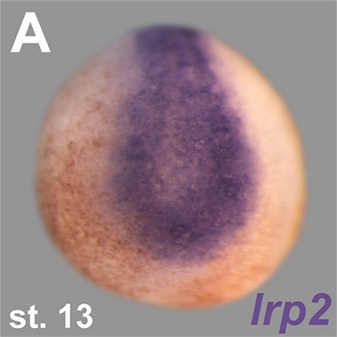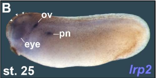 lrp2 encodes a large plasma‑membrane LDL‑receptor family member that functions as a multi‑ligand endocytic receptor mediating uptake of vitamin D‑binding protein, retinol‑binding protein, albumin and r...[+]