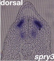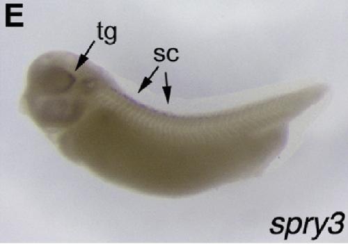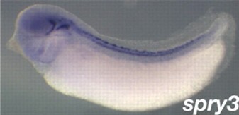 spry3 is a cytoplasmic signaling regulator that antagonizes fibroblast growth factor receptor–mediated MAPK/ERK signaling; it functions as a feedback inhibitor of FGF signaling pathways. It is expresse...[+]