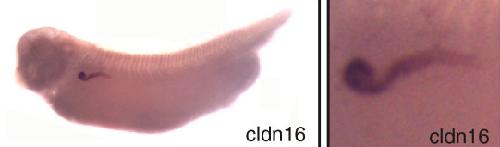 cldn16 encodes a membrane‑bound tight junction protein that localizes to the plasma membrane at tight junctions of epithelial cells; it functions in paracellular ion transport, specifically facilitatin...[+]