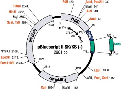 | Vector Details | Vector Map | Name: pBluescript II SK- Type: plasmid 5' Restriction Site: null 3' Restriction Site: null |