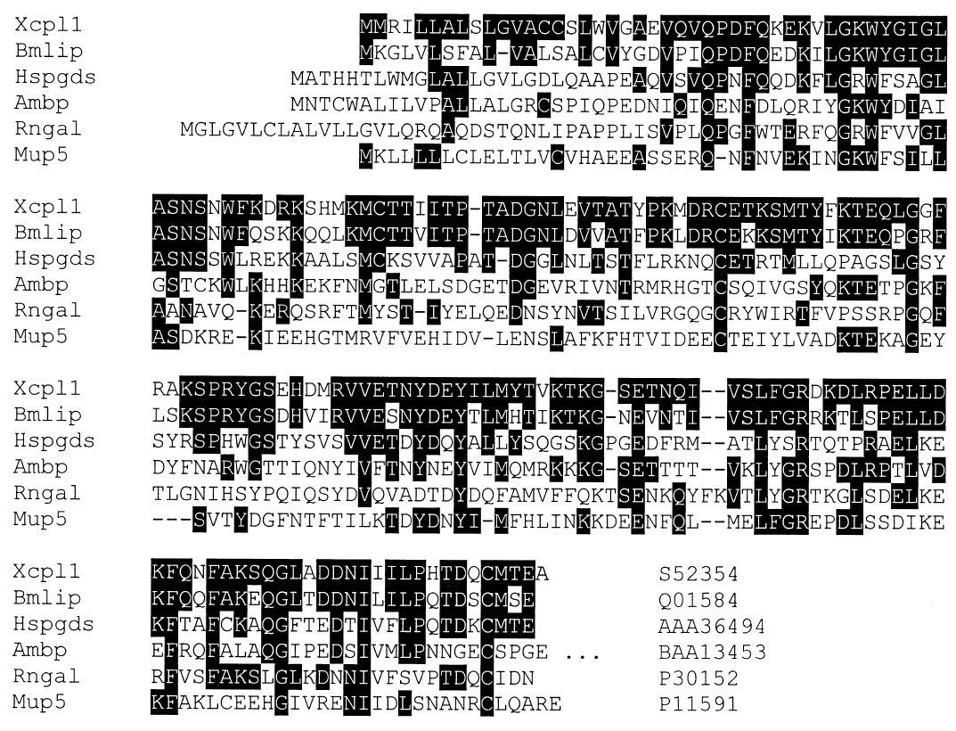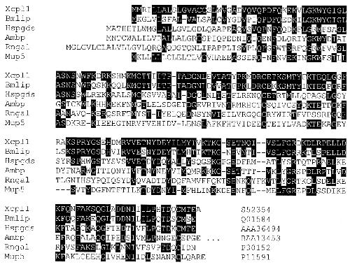 marked as dashes have been introduced. Residues identical in Xcpl1 and aligned lipocalins have been labelled by black boxes. Xcpl1