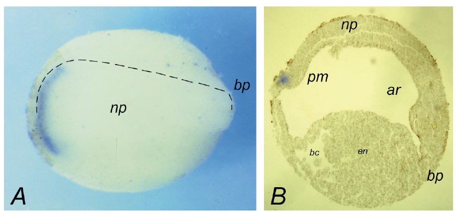 plate (np), blastoporus (bp) to the right. (B) Histological mid-sagittal section. ar, archenteron; bc, blastocoel; pm, precordal mesoderm.