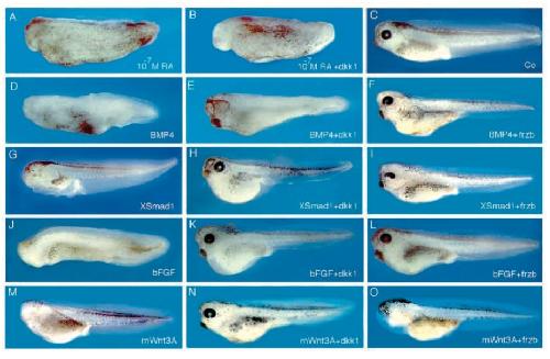 Fig. 7. dkk1 rescues embryos posteriorized by bFGF, BMP4, XSmad1 and Wnt3A, but not by RA. Where indicated, embryos were injected radially at the four-cell stage with dkk1 or frzb mRNA. (A,B) Embryos treated from stages 8-13 with 10â7M retinoic acid (RA). (D-F) Embryos were injected radially at the four- cell stage with BMP4 or (G-I) XSmad1 mRNA. (J-L) Embryos were injected radially at the four-cell stage with dkk1 or frzb mRNA and at the blastula stage with bFGF protein into the blastocoel. (M-O) Embryos were injected animally at the four-cell stage with mWnt3A plasmid DNA. (C) Uninjected control. |