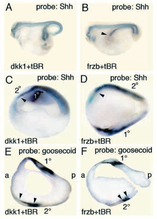 Fig. 2. dkk1 but not frzb induces complete prechordal plates. (A,B) In situ hybridization with sonic hedgehog (Shh) in embryos coinjected at the four-cell stage ventrally with tBR and either dkk1 (A) or frzb (B). Stage-30 embryos are shown from the anterior. Arrowhead indicates the anterior limit of Shh expression. (C-D) in situ hybridization for Shh in embryos injected at the four-cell stage ventrally with nuclear lacZ lineage tracer, tBR and either dkk1 (C) or frzb (D). Stage-16 embryos were cut sagittally; secondary axes are marked by light blue β-gal staining. Arrowheads indicate the anterior limit of secondary Shh expression. Note that the expression in the prechordal plate in (D) is lacking. (E,F) In situ hybridization for goosecoid (gsc) in embryos injected as in A and B. Sagittal sections of stage-14 embryos are shown. Arrowheads indicate the mesodermal zone of gsc expression in the anterior mesoderm of the induced secondary axis (2. Note that mesodermal gsc expression extends anterior to the neuroectodermal in the primary axis (1 and secondary axis induced by dkk1, but is in register with the neural expression in frzb-injected embryos (F). a, anterior; p, posterior. |
