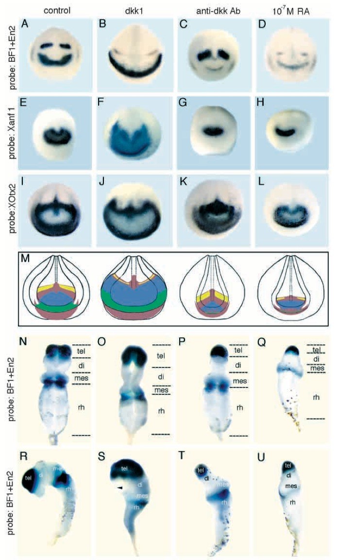 Fig. 4. dkk1 regulates anteroposterior patterning of neurectoderm. (A,E,I) control embryos, (B,F,J) embryos injected radially at the four-cell stage with dkk1 (C,G,K) embryos injected with anti15 Ab into the blastocoel and (D,H,L) embryos treated with 10â7 M retinoic acid (RA). In situ hybridization for BF1 and En2 (A-D), Xanf1 (E-H), and XOtx2 (I-L). Midgastrula-stage embryos (stage 15) are shown from anterior, dorsal side up.