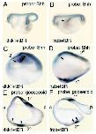 Fig. 6. Timing of dkk1 action. (A,F) Schematic drawings of experiments. The anterior halve of the gastrocoel roof containing the head anlage was excised from stage 12.5 or 13.5 embryos and cultured in the presence of anti14 (control, D,E) or anti15 Ab (B,C) until stage 20, then transferred to 0.5Barth solution and cultured for an additional 24 hours. Note cyclopia in (B). (F-J) Anterior halves of gastrocoel roof excized from stage-12.5 or -13.5 embryos were conjugated with animal caps, injected with dkk1 mRNA (G,H) or control animal caps (I,J) and cultured for 2 days. Note that the head in G is strongly anteriorised. |