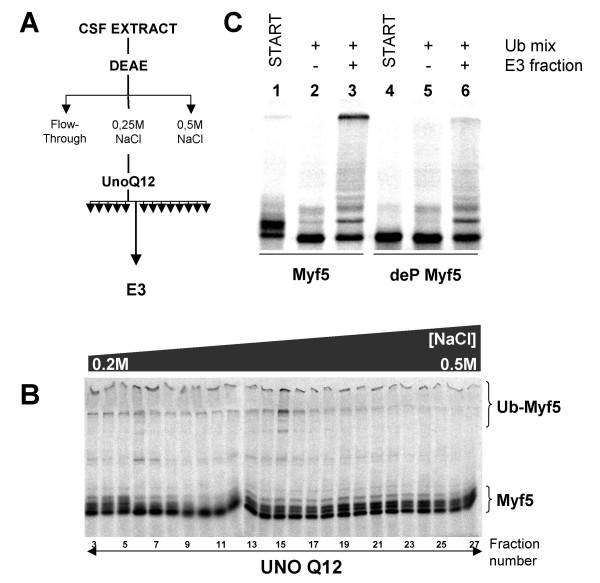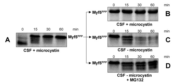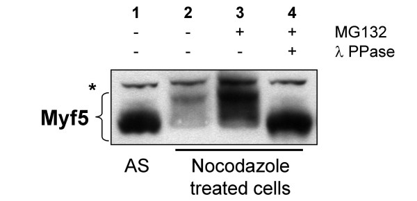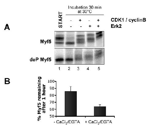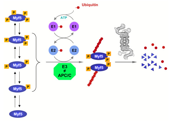 The two myogenic regulatory factors Myf5 and MyoD are basic helix-loop-helix muscle transcription factors undergoing differential cell cycle dependent proteolysis in proliferating myoblasts. This regulated degradation results in the striking expression of these two factors at distinct phases of the cell cycle, and suggests that their precise and alternated disappearance is an important feature of myoblasts, maybe connected to the maintenance of the proliferative status and/or commitment to the myogenic lineage of these cells. One way to understand the biological function(s) of the cyclic expression of these proteins is to specifically alter their degradation, and to analyze the effects of their stabilization on cells. To this aim, we undertook the biochemical analysis of the mechanisms governing Myf5 mitotic degradation, using heterologous systems. We show here that mitotic degradation of Myf5 is conserved in non-myogenic cells, and is thus strictly under the control of the cell cycle apparatus. Using Xenopus egg extracts as an in vitro system to dissect the main steps of Myf5 mitotic proteolysis, we show that (1) Myf5 stability is regulated by a complex interplay of phosphorylation/dephosphorylation, probably involving various kinases and phosphatases, (2) Myf5 is ubiquitylated in mitotic extracts, and this is a prerequisite to its degradation by the proteasome and (3) at least in the Xenopus system, the E3 responsible for its mitotic degradation is not the APC/C (the major E3 during mitosis). Altogether, our data strongly suggest that the mitotic degradation of Myf5 by the ubiquitin-proteasome system is precisely controlled by multiple phosphorylation of the protein, and that the APC/C is not involved in this process.