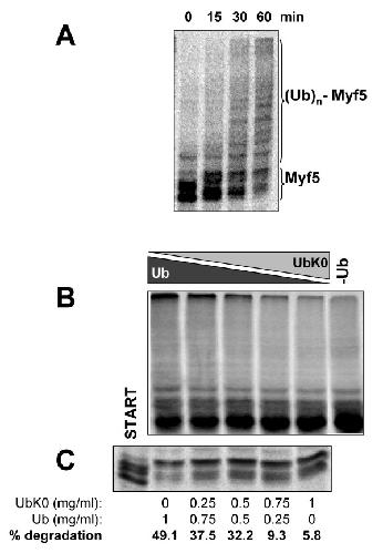 Abu Hatoum, Degradation of myogenic transcription factor MyoD by the ubiquitin pathway in vivo and in vitro: regulation by specific DNA binding. 1998, Pubmed