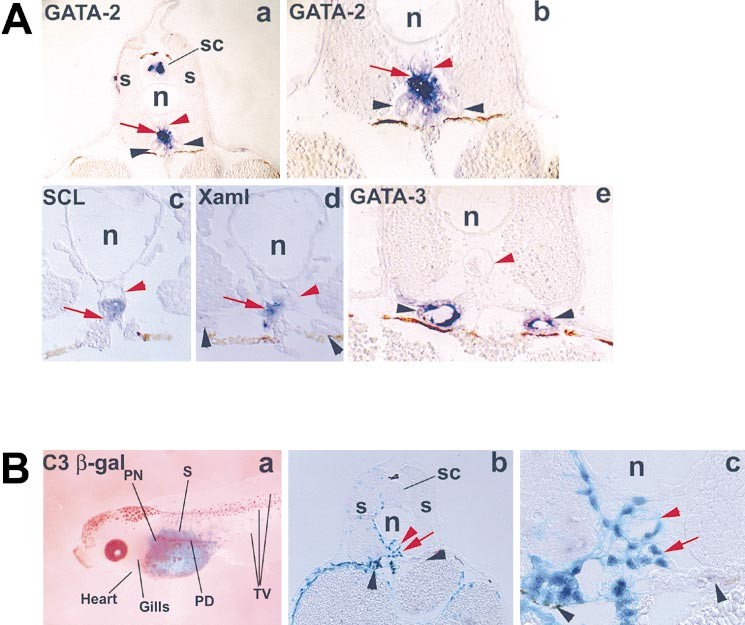 Figure 4. Localization of Hematopoietic Precursors in the Region of the Dorsal Aorta and Their Origins (A) In situ hybridization on 10 um sections reveals expression of GATA-2 (a and b), SCL (c), Xaml (d), and GATA-3 (e) in the region of the dorsal aorta of stage 43 embryos. Notice that both GATA-2 and Xaml are expressed in clusters within the dorsal aorta, in the ventral wall of the dorsal aorta, and in mesenchymal cells below the dorsal aorta. SCL is mainly expressed in the ventral wall of the dorsal aorta and in clusters within the aorta. GATA-3 is expressed in the pronephric ducts only. GATA-2, SCL, and Xaml expression are not detected in circulating blood cells at this stage of development (data not shown). All sections are transverse. Red arrows indicate expression in the ventral wall of the dorsal aorta and in mesenchyme below the aorta. Red arrowheads indicate the endothelial lining of the dorsal aorta. Black arrowheads indicate the pronephric ducts. n, notochord; sc, spinal cord; s, somites. (B) Detection of beta-galactosidase activity at stage 43 in C3 beta-gal injected embryos. (a) location of beta-galactosidase in a stage 43 embryo which was injected with beta-gal RNA in the C3 blastomere at the 32-cell stage. Note that beta-gal is not detected in the heart, gills, and tail vessels (TV) where circulating blood cells are easily detected, indicating that C3 does not contribute to the primitive blood. (b) Ten micrometer transverse section of another C3 embryo at the A/P level of the single median dorsal aorta (just posterior to the glomus). (c) Same section magnified. Red arrowheads indicate the endothelial lining of the dorsal aorta. Red arrows indicate beta-gal positive mesenchymal cells located just ventral to the dorsal aorta. Black arrowheads indicate pronephric ducts. beta-gal positive cells are also located further anterior in the paired dorsal aortae, pronephros, and the glomus (data not shown). n, notochord; s, somites; sc, spinal cord; PD, pronephric ducts; PN pronephros; TV, tail vessels.
