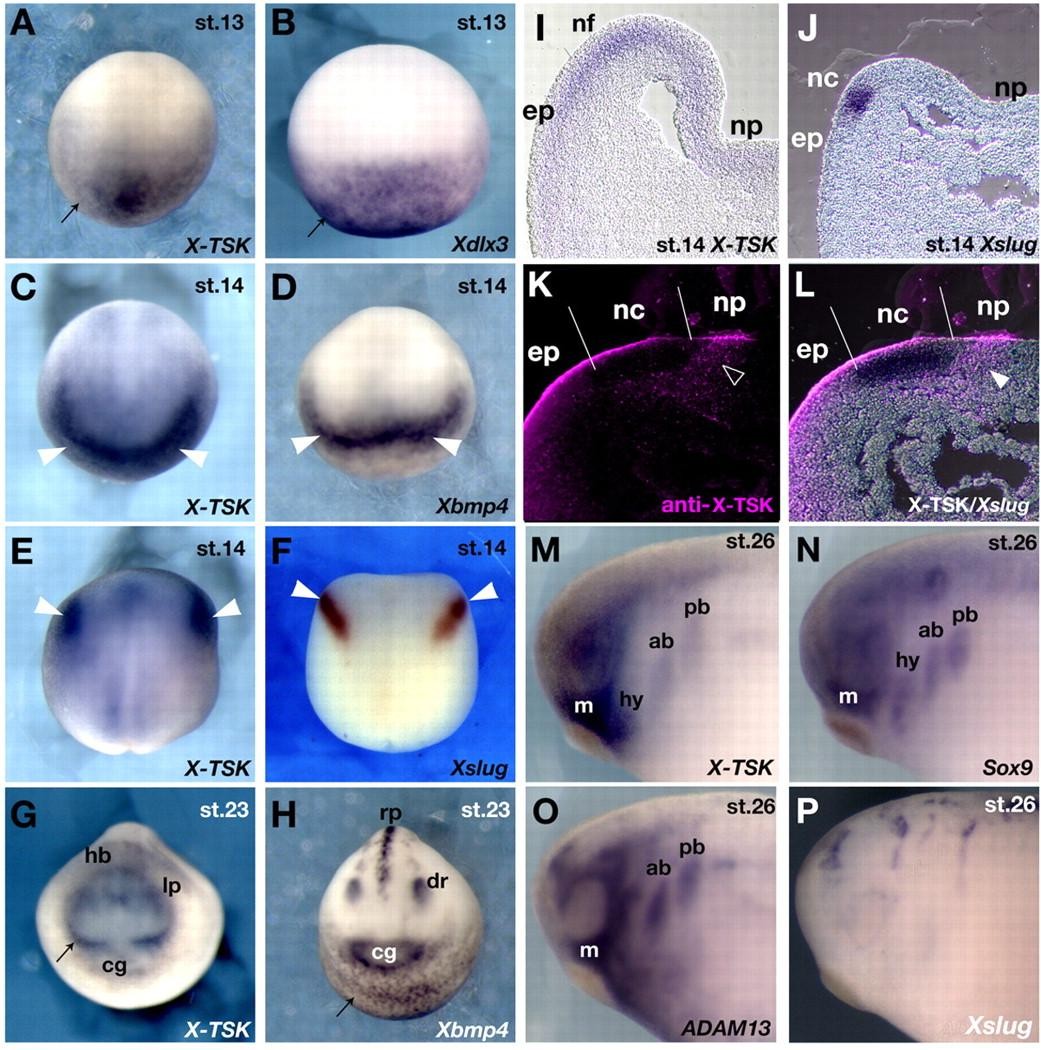 Fig. 1. Expression patterns of X-TSK and marker genes during development. Results of whole-mount in situ hybridization. (A,B) Stage13, anterior views; dorsal is upwards. (A) X-TSK and (B) Xdlx3. Both genes are expressed in the presumptive epidermal region (arrows). (C,D) Stage 14, anterior views. (C) X-TSK and (D) Xbmp4. Both genes are expressed in the anterior neural plate fold (arrowheads). (E,F) Stage 14, dorsal views; anterior is upwards. (E) Bilateral expression of X-TSK outside the neural plate (arrowheads). (F) Xslug expressed in premigratory neural crest cells (arrowheads). (G,H) Stage 23, anterior views. (G) Expression of X-TSK in the hindbrain (hb), lens placode (lp) and cranial neural crest derivative (arrow), but not in the epidermis or cement gland (cg). (H) Expression of Xbmp4 in the roof plate (rp), dorsal retina (dr), cement gland and epidermis (arrow). (I,J) Sections of hybridized embryos. Expression of X-TSK (I) and Xslug (J) in the anterior neural plate region in stage 14 embryos. X-TSK is expressed in the anterior neural fold (nf) and epidermal region (ep) (I), while Xslug is expressed in a narrow area of the neural crest (nc; J). (K,L) Section at the cranial neural crest level at stage 16. Lines indicate the border of each area. (K) X-TSK protein localization. (L) The merged image of K and the image of Xslug hybridized embryo. X-TSK is localized on the surface ectoderm and in the proximal edge of neural crest cells (arrowheads). (M) X-TSK expression at stage 26 was found in mandibular neural crest (m), anterior branchial crest (ab) and posterior branchial crest (pb), and very weakly in hyoid neural crest segments (hy). (N) Sox9, (O) ADAM 13 and (P) Xslug expression at stage 26.