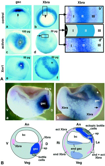 Fig. 5. (A) Patterns of gene expression in normal embryos (a,b, vegetal view) and in embryos injected with the indicated amounts of mRNAs coding for activin (c,d, animal view) or Xnr1 (e,f, animal view). In normal gastrula embryos the dorsal marker goosecoid (gsc) is expressed directly on the lip (a). The transcripts of the panmesodermal marker Xbra form a ring in the marginal zone with a gap between the bottle cells and the Xbra positive region (b). Injection of activin or Xnr1 mRNA generates similar ectopic expression patterns of these markers in the animal cap: gsc is expressed near the ectopic bottle cells (c,e), whereas Xbra is induced at some distance to them (d,f). At an intermediate level of injected activin mRNA the pattern at the ectopic âlipâ closely resembles the wild type situation (compare bâ² with dâ²). The schematic drawing illustrates the different domains abutting endogenous and ectopic bottle cells. Domain I represents the gap between the Xbra domain (domain II) and the bottle cell region whereas domain III represents a distalXbra negative domain. Arrows indicate the endogenous bottle cells in a,b and ectopic bottle cells in d. (B) Top: double in situ analysis of gsc (blue) and Xbra (magenta) in control (a) and in embryos injected with activin mRNA (b). Whole-mount in situ hybridization was performed on dissected embryos to visualize internal patterns of transcript distribution. Bottom: interpretative drawings of the expression domains in (a) and (b). On the dorsal side of uninjected embryos goosecoid signal is found in deeper mesendodermal regions whereas Xbra-transcripts occur in more peripheral regions (a). (b) Ectopic internal patterns in an embryo injected with activin mRNA. The embryo is cut perpendicular to the dorsalâventral axis. As in the control Xbra and gsc transcripts are separated from each other (arrow). Gsc is expressed in the tissue underneath the bottle cell field but cannot be found in the bottle cells themselves. Abbreviations: An, animal; bc, blastocoel; D, dorsal; ect, ectopic; end, endogenous; ep, epithelium; Le, left; Ri, right; V, ventral; Veg, vegetal. Asterisks indicate the injection sites in (A,B).