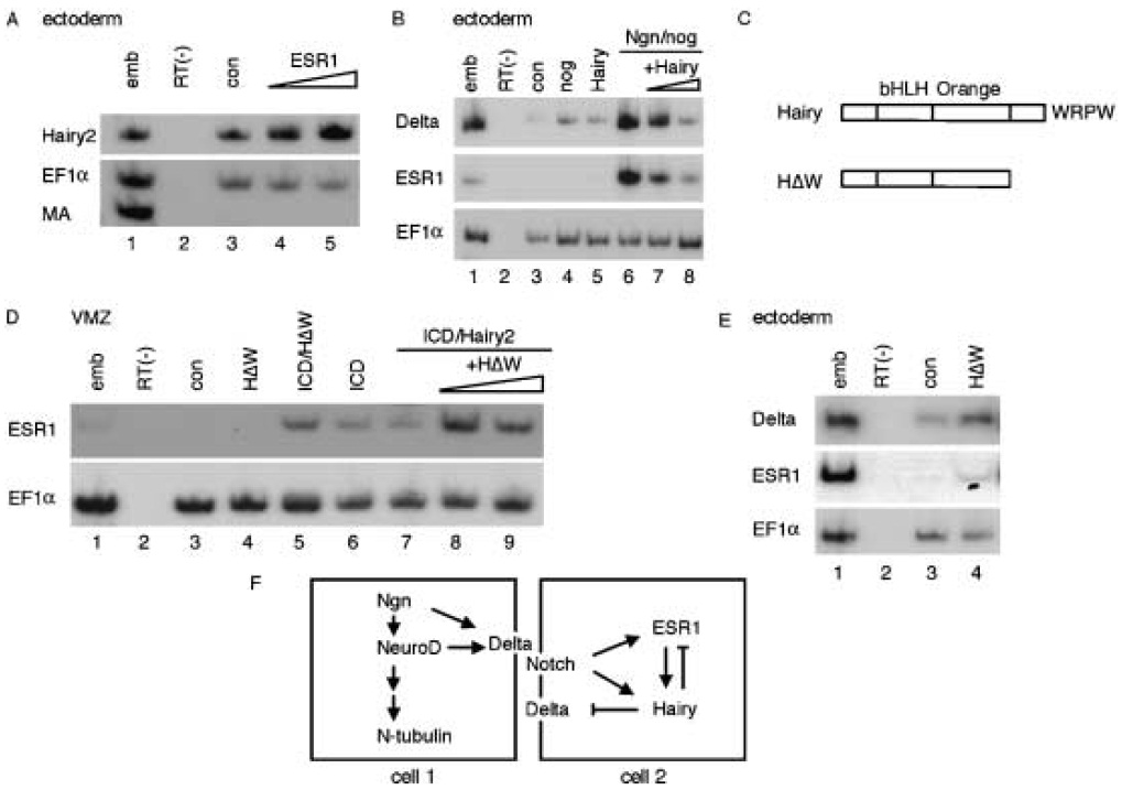 2 (C), rescued the repressed expression of ESR 1 by Hairy 2 in VMZ (D) and de-repressed expression of Delta and ESR 1 in normal