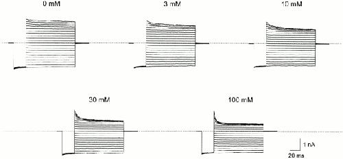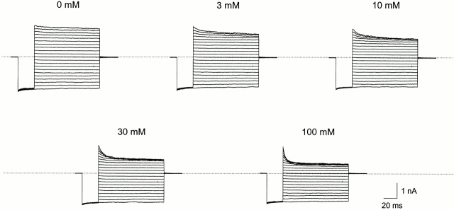 Figure 3. IRK1 current in the presence of various concentrations of intracellular HEPES in addition to 10 mM phosphate. The voltage protocol was as in Fig. 1; all records were from the same patch. The extracellular solution contained 10 mM phosphate but no HEPES. |