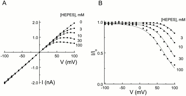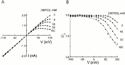Figure 4. Current–voltage relationship of the IRK1 channel in the presence of various concentrations of intracellular HEPES. (A) Steady state I-V curves with various concentrations of intracellular HEPES, obtained from the data shown in Fig. 3. (B) Ratios of the I-V curves with and without HEPES shown in A. The curves superimposed on the data are fits of the equation I/Io = Kd/(Kd + [HEPES]), where Kd = Kd(0 mV) e−ZFVm/RT. The fits yield Kd(0 mV) = 0.96 ± 0.04 M and Z = 1.0 ± 0.1 (mean ± SEM; n = 4). |