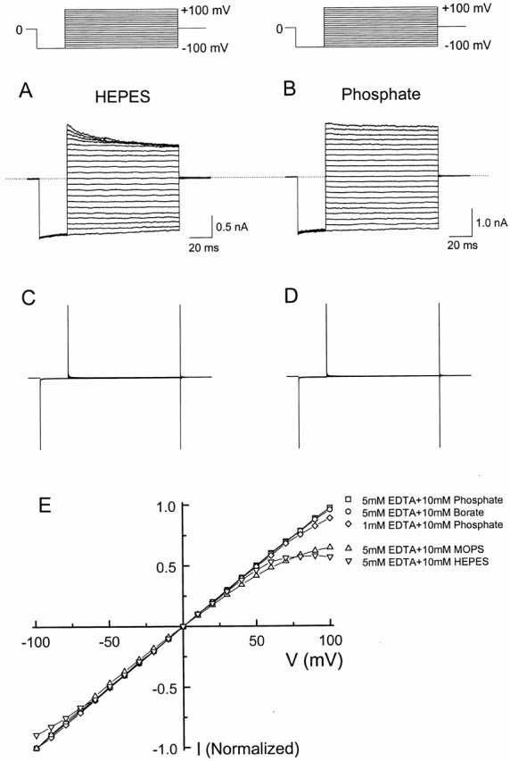 Figure 1. Current–voltage relationship of the IRK1 channel in the presence of various pH buffers. (A and B) Current traces recorded from inside-out patches at membrane voltages between −100 and +100 mV in 10-mV increments, corrected for the background currents shown in C and D, respectively. Both intracellular and extracellular solutions contain either HEPES (A) or phosphate (B). The dashed lines identify the zero-current levels. (E) Normalized steady state I-V curves with intracellular solutions containing (mM): 10 phosphate and 5 EDTA (□), 10 borate and 5 EDTA (○), 10 phosphate and 1 EDTA (⋄), 10 MOPS and 5 EDTA (▵), and 10 HEPES and 5 EDTA (▿). In each case, the extracellular pH buffer was the same as in the intracellular solution. |