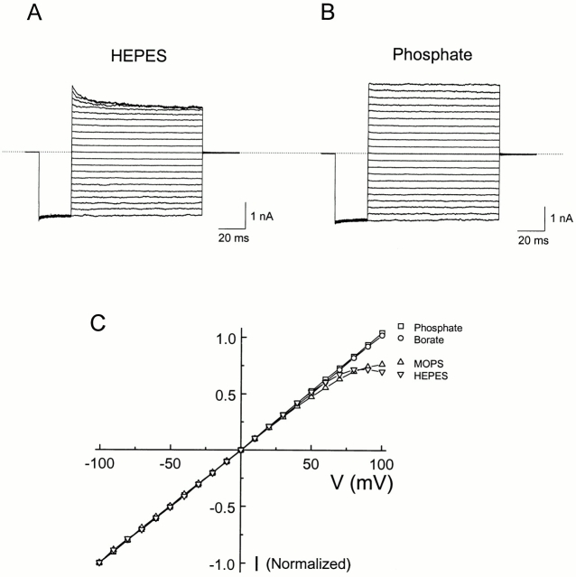 Figure 2. Current–voltage relationship of the D172N mutant IRK1 channel in the presence of various pH buffers. (A and B) Current traces of the D172N channels recorded from inside-out patches with voltage protocol as in Fig. 1. Both intracellular and extracellular solutions contained either HEPES (A) or phosphate (B). (C) Normalized steady state I-V curves with intracellular solutions buffered by: phosphate (□), borate (○), MOPS (▵), and HEPES (▿). In each case, the extracellular pH buffer was the same as in the intracellular solution. |