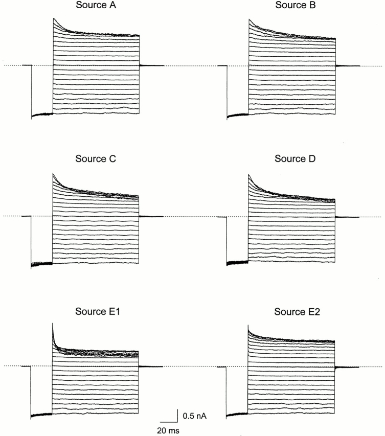 Figure 5. IRK1 current in the presence of 10 mM HEPES from different sources in the intracellular solution. All current traces were obtained from the same patch. The voltage protocol was as in Fig. 1. The extracellular solution contained 10 mM phosphate but no HEPES. |