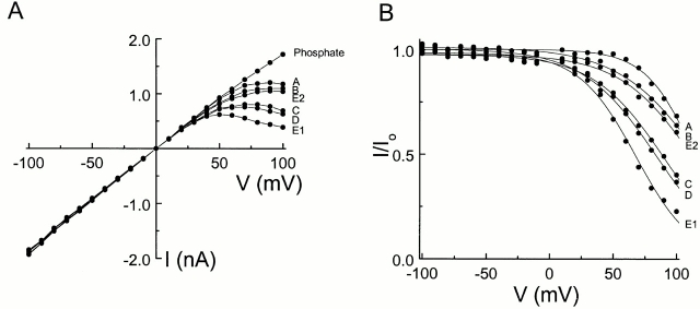 Figure 6. Current–voltage relation of the IRK1 channel in the presence of 10 mM HEPES from different sources. (A) The linear steady state I-V curve was obtained in the presence of 10 mM intracellular phosphate without HEPES; the others were obtained in the presence of HEPES from the various sources used for the data shown in Fig. 5. All seven I-V curves were obtained from the same patch as in Fig. 5. (B) Ratios of the I-V curves with and without HEPES shown in A. The curves superimposed on the data are fits of the equation in Fig. 4. The fitted Kd values (M) are: 1.11 ± 0.06, 0.89 ± 0.10, 0.36 ± 0.04, 0.39 ± 0.02, 0.34 ± 0.02, and 0.65 ± 0.07 (mean ± SEM; n = 4) for sources A, B, C, D, E1, and E2, respectively. The fitted Z values are: 1.02 ± 0.01, 0.97 ± 0.01, 0.97 ± 0.01, 1.00 ± 0.01, 0.98 ± 0.01, and 0.97 ± 0.01 for 0.07 (mean ± SEM; n = 4) for sources A, B, C, D, E1, and E2, respectively. |