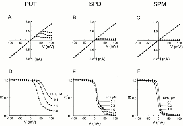 Figure 7. Current–voltage relation of the IRK1 channel in the presence of intracellular di- and polyamines. (A–C) Steady state I-V curves in the absence or presence of various concentrations of intracellular putrescine, spermidine, or spermine. (D–F) Ratios of the I-V curves with and without putrescine, spermidine, or spermine shown in A–C. The concentrations of the blockers were as indicated. The curves superimposed on the data in D or in E and F are fits of Eqs. 2 and 6, respectively, of Guo and Lu 2000a. Parameter values obtained from the fits are as follows (mean ± SEM; n = 3). For putrescine, K1 = 8.2 (± 0.9) × 10−4 M, Z1 = 1.9 ± 0.2; k−2/k−1 = 4.0 (± 0.5) × 10−2, “z−1 + z−2” = 1.6 ± 0.1. For spermidine, Ka1 = 3.9 (± 0.5) × 10−6 M, Za1 = 5.4 ± 0.4; ka−2/ka−1 = 2.7 (± 0.4) × 10−2, “za−1 + za−2” = 5.6 ± 0.4; Kb1 = 4.5 (± 0.6) × 10−5 M, Zb1 = 3.3 ± 0.4; kb−2/kb−1 = 2.0 (± 0.2) × 10−3, “zb−1 + zb−2” = 3.4 ± 0.5. For spermine, Ka1 = 2.4 (± 0.3) × 10−7 M, Za1 = 5.5 ± 0.4; ka−2/ka−1 = 3.5 (± 0.4) × 10−2, “za−1 + za−2” = 5.7 ± 0.5; Kb1 = 6.8 (± 0.7) × 10−6 M, Zb1 = 3.6 ± 0.3; kb−2/kb−1 = 6.9 (± 0.8) × 10−4, “zb−1 + zb−2” = 3.5 ± 0.4. |