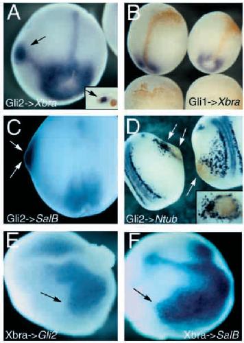 (A,B) Ectopic expression of Xbra in a Gli2-injected gastrula (stage