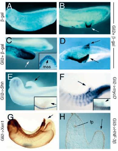 differentiation is detected in Gli2-induced ectopic tails (arrow). (H)