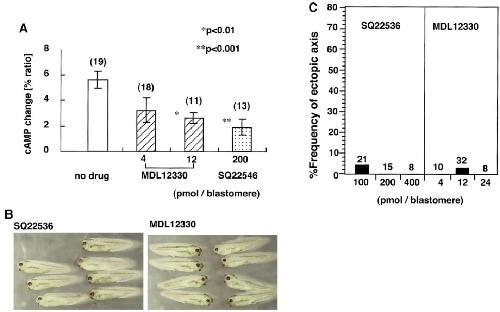 injection of SQ22536 (200 pmol/blastomere) or MDL12330A (12 pmol/blastomere) showed no gross effect on embryonic development. (C)