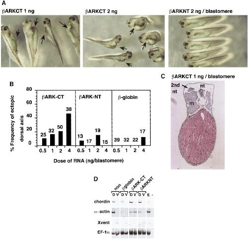 ectopic dorsal axis. Increasing dose of bARK-CT up to 2 ng/blastomere induced a combined posterior truncation with an ectopic axis