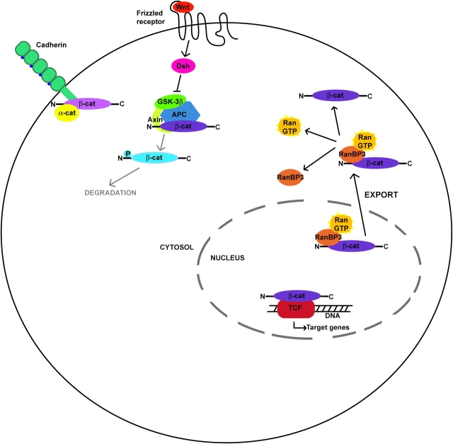 Figure 1. RanBP3 promotes export of activated β-catenin. During Wnt signaling, the AxinâGSK3βâAPC phosphorylation/predestruction complex is inactivated and leads to cytosolic accumulation of a form of β-catenin that is unphosphorylated at GSK3β-dependent serines 37 and 41. This âactivatedâ form is then available to enter the nucleus and participate as a coactivator for the transcription of TCF target genes. Data presented by Hendriksen et al. (2005) supports a model in which this activated form of β-catenin is exported from the nucleus by RanBP3 in a RanGTP-dependent manner. Cytosolic Ran GTPase-activating proteins promote GTP hydrolysis and presumably release the active form of β-catenin in the cytosol.