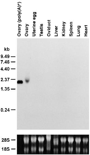 2 days after ovulation. Total RNA (10 μg) and poly(A)+ RNA