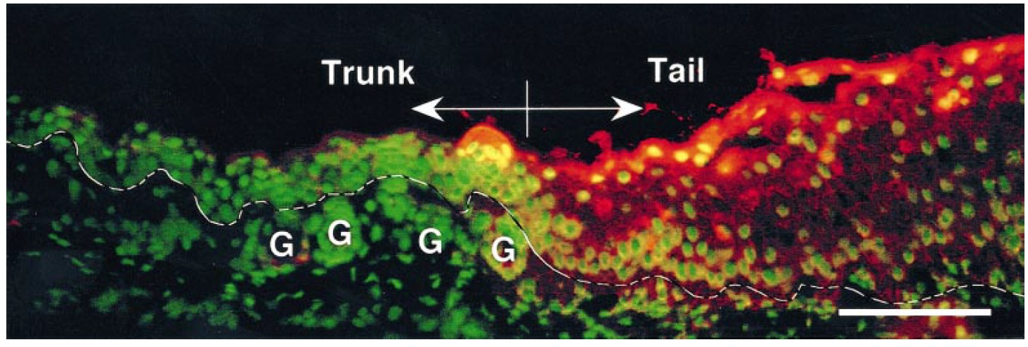 Fig. 2. Immunohistochemistry of the border area between the trunk and tailepidermis at the metamorphic climax stage using the