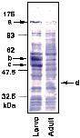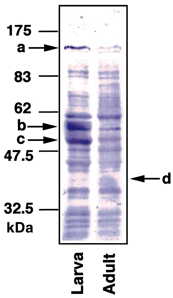 (a) is seen in the larval lane but only faintly in the adult. Larval