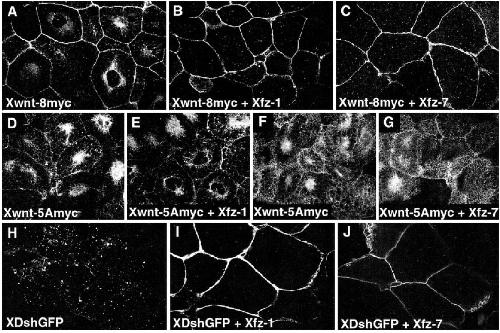 Coexpression of Xfrizzled-1 or Xfrizzled-7 results in a recruitment of Xwnt-8 to the plasma membrane. (E) Xwnt-5A is not recruited by