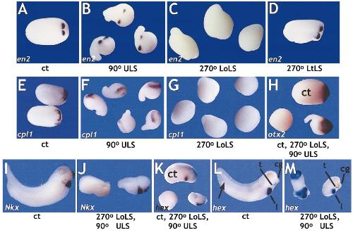 FIG. 6. Results of specification testing, evaluated for anterior marker genes by in situ hybridization. (A) Late neurula control, en2, dorsal view. (B) 90° ULS expresses en2. (C) 270° LoLS does not express en2. (D) 270° LtLS expresses en2, dorsal view. (E) Late neurula controls express cpl1, almost lateral (top) and dorsal (bottom) views. (F) Five 90° ULS express cpl1. (G) Five 270° LoLS do not express cpl1. (H) otx2 expression in st. 20 control (top), 270° LoLS (bottom left, negative), and 90° ULS (bottom right, positive). (I) Control st. 35 expresses Nkx2-5 in heart and pharyngeal arches. (J) 270° LoLS (left, negative) and 90° ULS (right, positive) expression of Nkx2-5. (K) XHex expression in control st. 24 (top), 270° LoLS (bottom left, negative), and 90° ULS (bottom right, positive). (L) XHex expression in control st. 35. Expression in vascular endothelial cells is marked by an arrow. (M). XHex expression in 270° LoLS (left, two domains positive) and 90° ULS (right, presumably in the thyroid, t, and liver, l, as in the control embryo). cg, cement gland. |