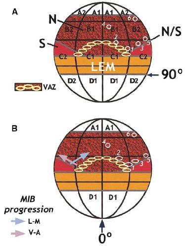 FIG. 10. Mediolateral intercalation within the notochord field causes patterned cell mixing. The embryo as shown in Fig. 1B has been rotated 90° so that the prime meridian is oriented toward the reader. Solely for illustrative and heuristic purposes, the following features listed below are shown as if they all occurred concurrently in an embryo. These features are taken from numerous stages in development. The features include st. 6 blastomeres and nomenclature, shown in black; prospective fate map boundaries between tissues, shown in gray; the approximate position of the vegetal alignment zone that forms at st. 10.5, indicated as an arc of yellow, elongated cells that spans the region of Spemann’s organizer; and the two directions in which cells are recruited to undertake mediolateral intercalation behavior (MIB) in shaved explants, shown on the left side (lateral to medial in blue and vegetal to animal in purple), while six cells are shown in white on the right. In (A), cells comprising the VAZ have elongated and initiated MIB. In (B), cells 1–3 have been recruited to undertake MIB in the pattern described for shaved explants by Shih and Keller (1992), while cells 4–6 have not yet been recruited. See text for discussion. It is important to realize that drawings are static renditions of highly dynamic processes in the embryo. For example, by the time cells 2 or 3 are recruited to undertake MIB, the upper blastopore lip has involuted and moved significantly toward the vegetal pole. By the time cells 5 or 6 are recruited, the blastopore would be closed or nearly so. Throughout this time, the two notochord/somite boundaries would be converging and the notochord field would be elongating. Furthermore, we caution readers that the position at which the vegetal alignment zone forms is known for the early gastrula embryo (Lane and Keller, 1997), but its position in relationship to the st. 6 blastomeres is currently under investigation. |
