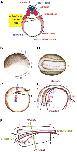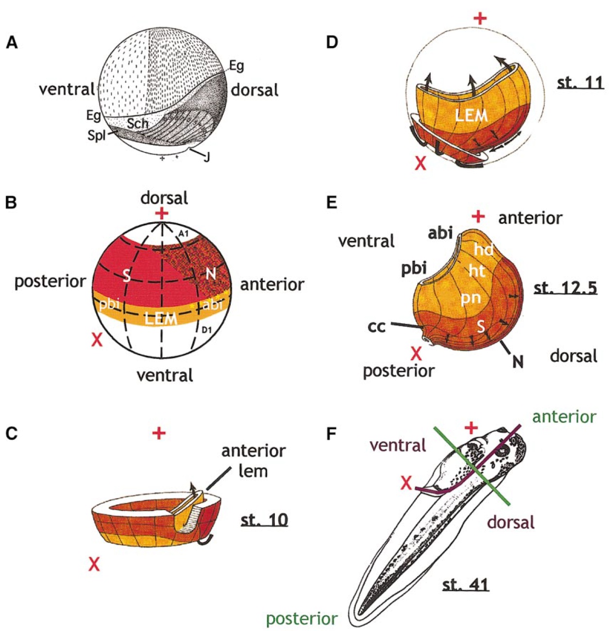 FIG. 1. Summary diagrams for two amphibian fate maps and diagrams of inversion of the marginal zone, including orientations of the anterior/posterior and dorsal/ventral axes of the tadpole. Early embryos (A, B) or marginal zones (CâE) shown are oriented by convention with their upper blastoporal lips on the lower right side. If this orientation could be held constant during morphogenesis by fixing the site of blastopore closure (X) and the animal pole (1), the resulting embryo would be oriented as shown in F. Tracing the inversion of the marginal zone through its morphogenetic movements should facilitate understanding how the prime meridian becomes the embryoâs anterior midline. (A) Axolotl late blastula-to-tailbud fate map (Vogt, 1929), constructed by vital dye mapping technique. The dorsal/ventral axis runs horizontally from the side on which the blastopore lip first forms (J, Spemannâs upper lip, Morganâs dorsal lip) to the side on which the lip forms last (Spemannâs lower lip, Morganâs ventral lip). The notochord is shown in heavy stippling on the dorsal side. The first 10 somites are indicated by numbers, the remainder of the prospective somite field is faintly stippled (Sch). Translations for other abbreviations include Eg, the limit of involution, and Spl, lateral plate mesoderm. In the animal region, the neural field is indicated by heavy dashed lines and the epidermal field by faint dashed lines. (B) Revised fate map for Xenopus laevis mesoderm, early blastula-to-tadpole (st. 6â41), constructed by lineage labeling (Lane and Smith, 1999). The anterior/posterior axis runs horizontally from the upper lip to the lower lip. The dorsal/ventral axis for the mesoderm (as well as the endoderm) runs from animal to vegetal. Two landmarks used by Vogt and Keller are indicated on the new Xenopus map: X marks the approximate site at which the blastopore lips close at st. 13; 1 marks the animal pole, which ultimately forms epidermis covering the heart. Notochord, N, and somites, S. (C) The marginal zone at st. 10. Anterior leading edge mesoderm (which will give rise to the anterior blood islands, head mesoderm, heart mesoderm, and liver) has begun its migration toward the animal pole, and dorsal mesoderm located just animal to the anterior leading edge mesoderm is displaced slightly toward the vegetal pole. (D) The marginal zone at st. 11. The leading edge mesoderm (LEM) through all 360° is internalized and migrating toward the animal pole, with anterior LEM advanced the farthest. Convergence within the prospective notochordal and somitic fields causes involution of the upper (dorsal) marginal zone and results in the blastopore constricting eccentrically in relation to the vegetal pole. (E) The marginal zone at st. 12.5. Anterior LEM migrates past the animal pole, where it will settle to form the anterior blood islands, abi; head mesoderm, hd; and heart, ht. Posterior LEM will give rise to the posterior blood islands, pbi, and other lateral plate derivatives, as well as the pronephros, pn, which is intermediate mesoderm. Converging posterior, dorsal mesoderm (prospective notochord and somites) forms a circumblastoporal collar, cc, around the closing blastopore, while posterior LEM cells are displaced from the blastopore. (F) St. 41 tadpole, oriented as if it had been held in place during development. The solid green line, separating anterior from posterior, is placed at the approximate level of somite 7, which evidence indicates is the connecting point between the head and the trunk in most vertebrates. The solid purple line separates dorsal from ventral. This series of diagrams illustrates how the prime meridian becomes the anterior midline during morphogenesis. A1 and D1 blastomeres are labeled in B to indicate orientation. |