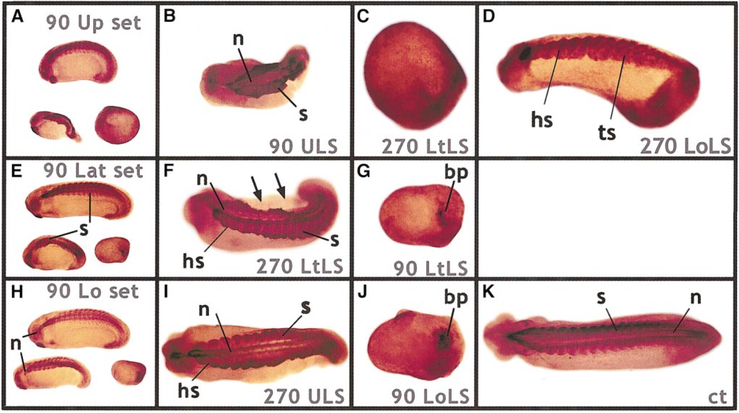 FIG. 5. Results of specification testing, evaluated by immunostaining for notochord (Tor 70) and muscle (12-101) differentiation, at late tailbud stage. (A, E, H) Lateral views of control embryos and matched sets, made as diagrammed in Fig. 3A. The fragment that contains the prime meridian is shown on the lower left and the matched fragment, which lacks a prime meridian, is shown on the lower right. (B) 90° ULS, dorsal view. (C) 270° LoLS, no axial mesoderm. (D) 270° LoLS, with one somite file containing head and trunk somites, lateral view. (F) 270° LtLS, dorsal view. (G) 90° LtLS, no axial mesoderm. The pigmented patch (bp) is the closed blastopore/proctodeum. (I) 270° ULS, dorsal view. (J) 90° LoLS, no axial mesoderm. (K) Control embryo, dorsal view. hs, head somites; n, notochord; s, somites; ts, trunk somites. |