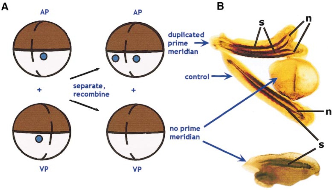 FIG. 7. Stewart recombinates generate full-sized embryos containing two or zero prime meridians. (A) Diagram of surgical recombination to generate full-sized embryos with either two prime meridians or no prime meridian. (B) Resulting embryos, stained for notochord and somites. Embryos with two prime meridians (dorsal view) form two separate heads and two anterior notochords, each flanked by two anterior somite files. The matching recombinate for this two-headed embryo formed no dorsal axial mesoderm. A control embryo (dorsal view) contains a single head and notochord; two somite files flank the latter. Many recombinates that lacked a prime meridian formed a bilateral body plan that contains either notochord and somites or only somites which span the midline. An example of the second result is shown in lateral view. Yolky endoderm sometimes protrudes from the blastopore, as in this specimen. There is often a knob at the anterior end, but this never forms a cement gland. These two anomalies appear at sites of contact between the embryo fragments and likely result from slight abnormalities in healing. |
