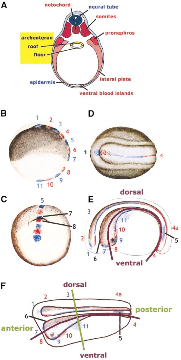 FIG. 9. Primary data adapted from Vogtâs axolotl fate map (Fig. 3 in Vogt, 1929; reproduced by permission of the publisher). Vogtâs labels are indicated in red or blue, corresponding to the color of the dye mark. Labels we added to facilitate discussion are shown in black. (A) The dorsal/ventral distribution of the three germ layers, illustrated schematically in a sagittal cross section of a tadpole. Following the standards of classical embryology, derivatives of the ectoderm are shown in blue, derivatives of the mesoderm in red, and derivatives of the endoderm in yellow. Graded colors indicate the dorsal/ventral distribution within a germ layer. Shades (colors tinged with black) represent dorsal tissues and tints (colors mixed with white) represent ventral tissues. For example, as dorsal endoderm, the archenteron roof is shown in dark yellow, and as ventral endoderm, the archenteron floor is shown in pale yellow. (B) Vogt placed a series of alternating red and blue vital dye marks along the prime meridian blastula (shown in lateral view, with the prime meridian to the right). (C) The upper lip appears subsequently, between marks 7 and 8 (gastrula shown in vegetal pole view, with the prime meridian up). (D) At neural plate stage, marks 1â4 are visible in the neural groove in an anterior-to-posterior sequence (neurula shown in dorsal view, anterior is left). (E) The final distribution of the dye marks (tailbud shown in sagittal section, anterior to the left). (F) To present the embryo in a somewhat Cartesian mode, we straightened the tailbud in (E). This emphasizes the ventral distribution of marks 8â11. The purple line approximates the final distribution of the bottle cells that formed the blastopore and thus separates dorsal from ventral endoderm. See text for full explanation. Extensive morphogenesis must still occur to generate a tadpole from a tailbud, but marks on the left side of the green line in (F), including 3 and 11, will reside in the tadpoleâs head. As the tail organizer takes over production of the axis, a tail that consists almost entirely of dorsal derivatives is built. Thus, the tail is included in the dorsal territory in Fig. 1B. |
