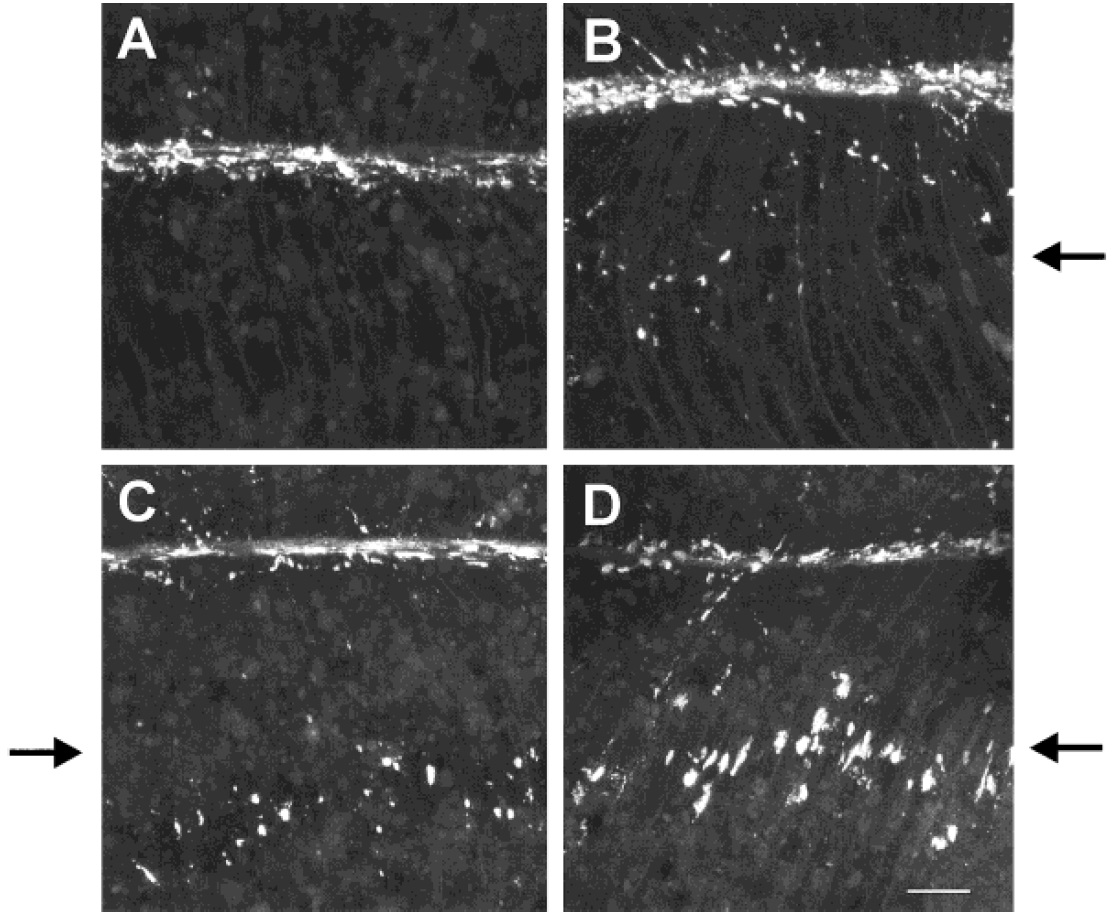 (bright areas) were obtained by confocal microscopy. Projected series of images are shown. Horizontal stripe of AChR aggregates at the top of each panel consisted of synaptic aggregates at the ends of myotomes. Ectopic aggregates were concentrated in a band near the center of myotomes (arrows). (A) Control muscle from embryo injected with 2.8 fmol GFP RNA. (B,C,D) Muscle from embryos injected with T1, T2, or T3 agrin fragment RNA (8.7 fmol). Bar 5 20 mm.