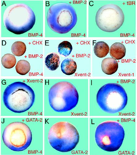 Interaction of BMP-2, Xvent-2, and GATA-2 with BMP-4. A-C, in situ whole mount hybridizations demonstrate dorsal activation of BMP-4 after injection of 400 pg of BMP-2 RNA into both dorsal blastomeres of four-cell stage embryos or inhibition after radial injection of 500 pg of truncated BMP receptor (tBR). D-F, BMP-4, Xvent-2, and Xvent-1 expression in CHX-treated embryos after injection of 400 pg of BMP-2 RNA. Note that CHX treatment prevents transcription of BMP-4and Xvent-1 but not of Xvent-2. G andJ, dorsal injection of 600 pg of Xvent-2 RNA activatesBMP-4 transcription in dorsal mesoderm; this activation is not observed with 500 pg of GATA-2 RNA. H and K,Xvent-2 and GATA-2 expression in uninjected embryos and in embryos after injection of BMP-2/4 RNA (400 pg) into both dorsal blastomeres of four-cell stage embryos (I and L). Except for CHX treatment all embryos are photographed with dorsal side (top) and ventral side (bottom). |