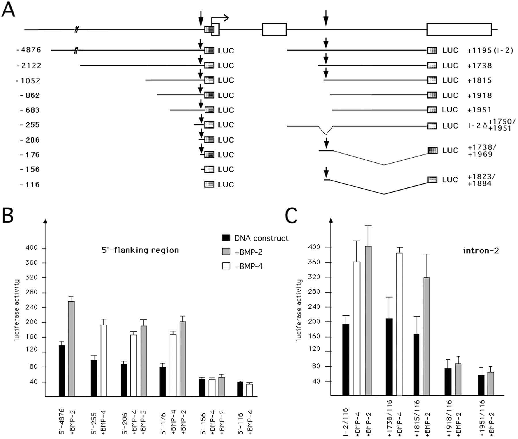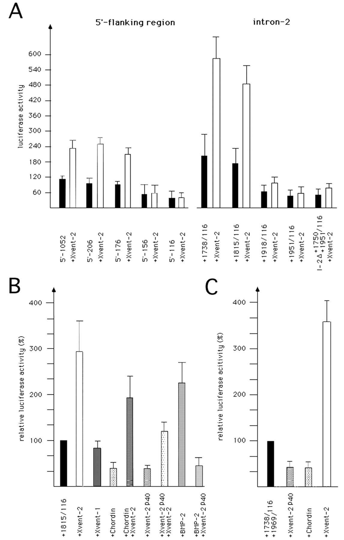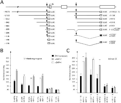 The 5′-flanking region and the second intron of the Xenopus BMP-4 gene respond to BMP-2/4 signaling. A, genomic structure of the Xenopus BMP-4 gene and schematic representation of mutants used for luciferase reporter gene assays. All mutants are numbered according to nucleotide position +1 of the transcription start site (indicated at the first exon) and all contain a −116/+54 minimal promoter fragment (shadowed) (additional mutants are described in Fig. 5).Arrows indicate sites responding to Xvent-2. B,DNA (20 pg) of upstream (B) or intron/reporter fusion constructs (C) were co-injected with 200 pg of BMP-2 or BMP-4 RNA, respectively, into both blastomeres of two-cell stage embryos. Luciferase activity was measured when uninjected control siblings had reached stage 12.5. |