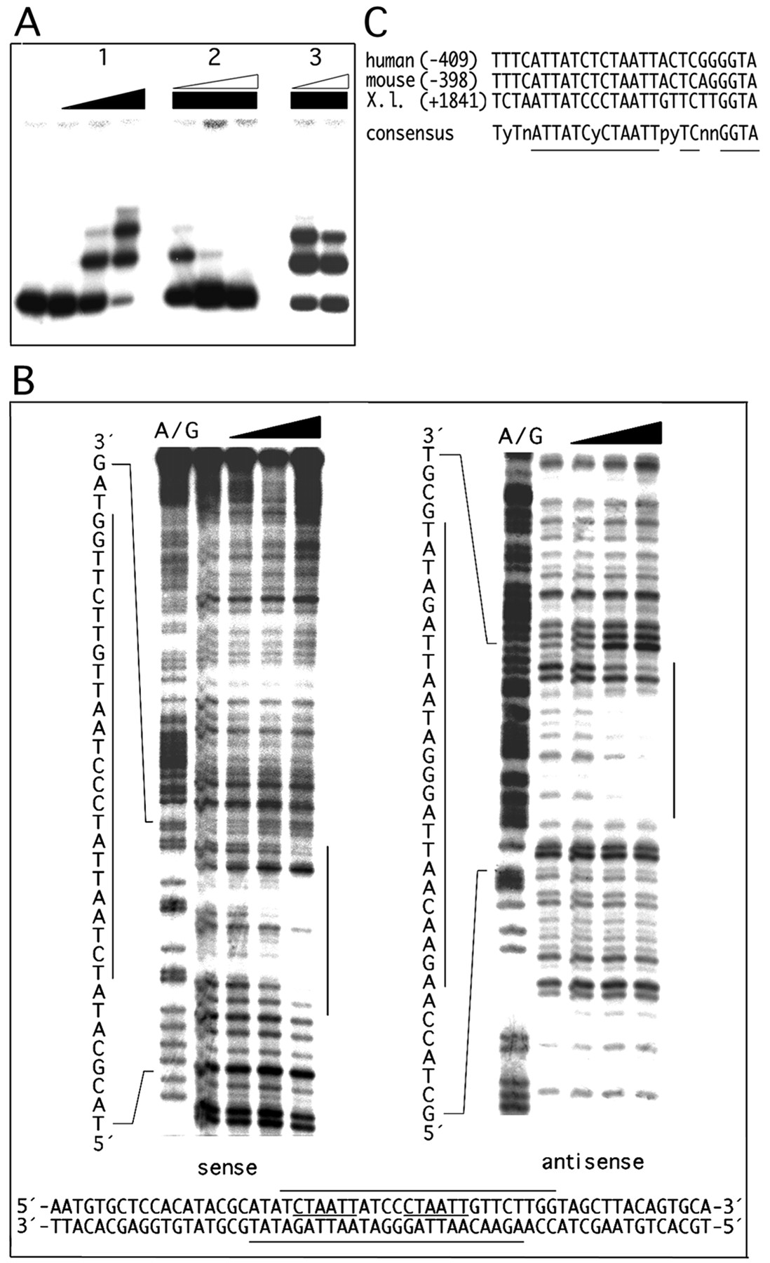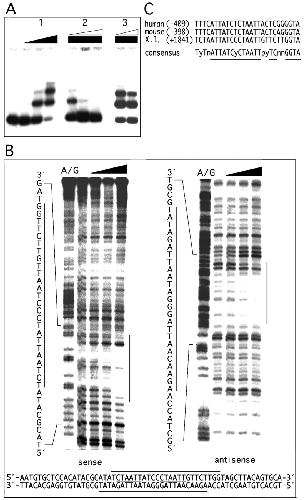 DNA/protein interactions. A,gel mobility shifts were performed with the bacterially expressed Xvent-2 homeodomain (HD) on the +1738/+1969 intron target sequence. 1, lane 1 contains free DNA;lanes 2–4 contain increasing amounts (6.25, 12.5, and 25 ng) of Xvent-2 HD. 2, addition of increasing amounts of unlabeled target sequence (specific inhibitor) leads to a loss of shift of the labeled target. 3, addition of an unspecific competitor (−69/+54 DNA fragment) does not prevent shifting.B, DNase I footprint of Xvent-2 HD was carried out for both strands on the +1738/+1969 intron 2 fragment. Lane 1 shows the A/G chemical sequencing reaction, lane 2 contains DNase I-digested free DNA. Increasing amounts (25, 75, and 225 ng) of Xvent-2 HD were added prior to DNase I digestion in lanes 3–5. Protected regions (indicated by lines) correspond for both strands and contain two copies of the motif 5′-CTAATT-3′ (underlined). Gene sequence is shown from nucleotide positions +1820 to + 1879. C, best fit alignment of theX. laevis Xvent-2-binding site with the human and mouseBMP-4 gene (number of matches: 13; allowed mismatches: 1). Note that a 13-bp match (including one T to C transition) is found within the proximal promoter of both the human (accession numberU43842) and the mouse BMP-4 genes (accession numberL47480). |