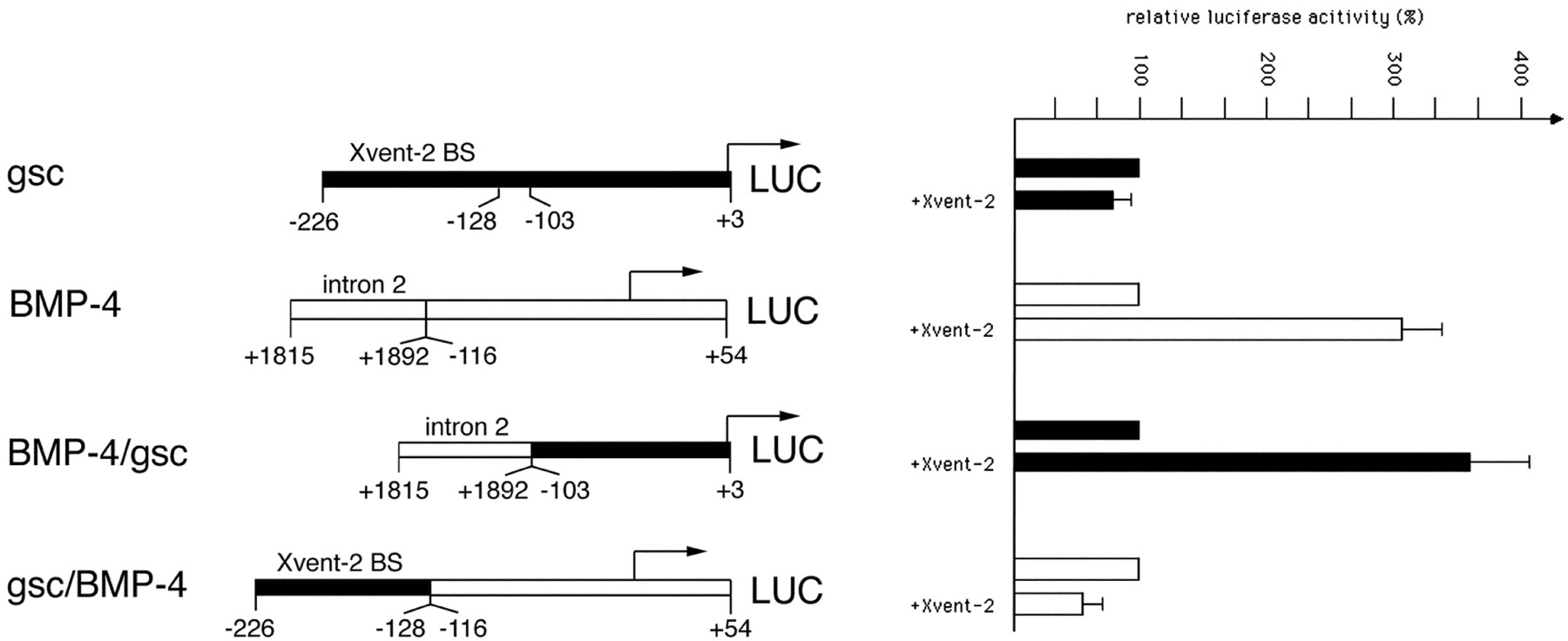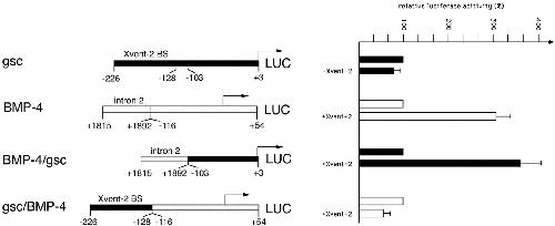 BMP-4/goosecoid promoter swapping. The goosecoid promoter has recently been shown to contain several Xom (Xvent-2)-binding sites (BS) located between −128 and −226, thereby mediating Xvent-2 caused repression of activin A-stimulated promoter/reporter activity (24). In contrast, the intron 2 enhancer (+1815/+1892) fused to the basalBMP-4 promoter yields a strong activation upon co-injection of Xvent-2. Promoter swapping of corresponding gsc and intron 2 enhancer regions reveals that not the basal promoters, but that the Xvent-2-binding sites are responsible for repression or activation, depending on the context. Reporter activities determined after injection of 20 pg of DNA constructs into dorsal blastomeres at the four-cell stage are set as 100%, the values obtained upon co-injection of 500 pg of Xvent-2 RNA are given as relative percentage. |