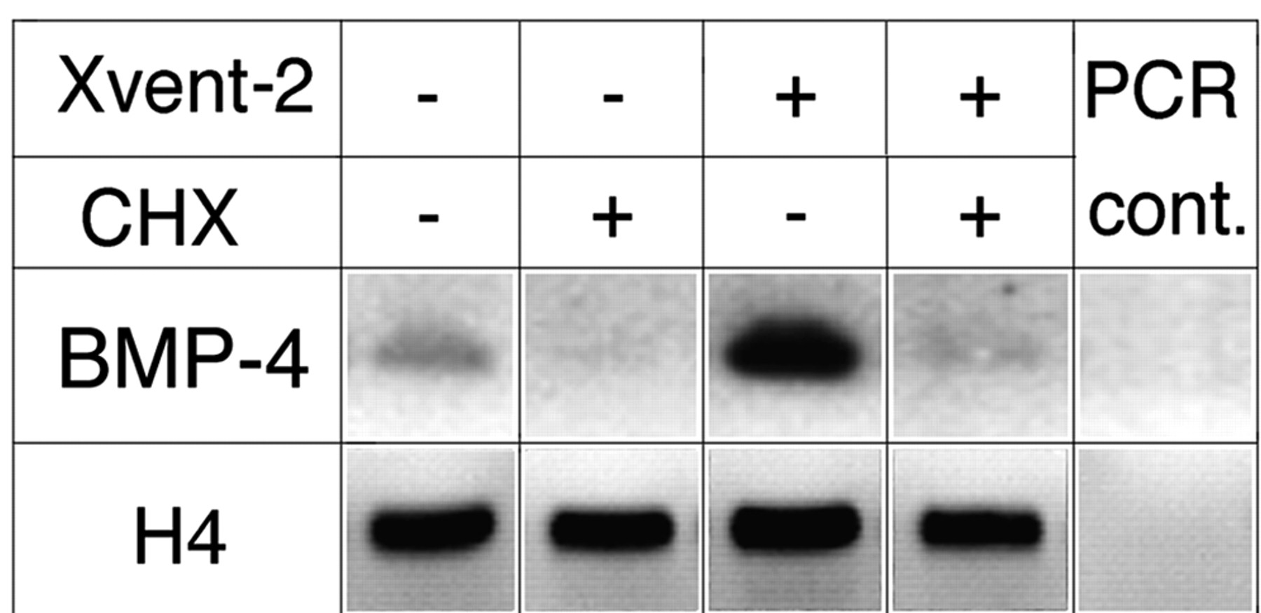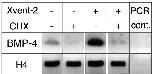 Cycloheximide treatment subsequent to Xvent-2 overexpression prevents BMP-4 gene activation. A, four-cell stage embryos were injected with 400 pg of Xvent-2 RNA into both dorsal blastomeres. Cycloheximide treatment was performed as described under “Experimental Procedures.” RT-PCR was performed with total RNA for BMP-4 (upstream primer: 5′-GATTGGCTGTCAAGAATCATGGA-3′; downstream primer 5′: GAACATCTGCAGCAGCGTCACCTCG-3′) and had been adjusted using histone H4 (upstream primer: 5′-CGGGATAACATTCAGGGTATCACT-3′; downstream primer: 5′-ATCCATGGCGGTAACTGTCTTCCT-3′) as an internal control. |