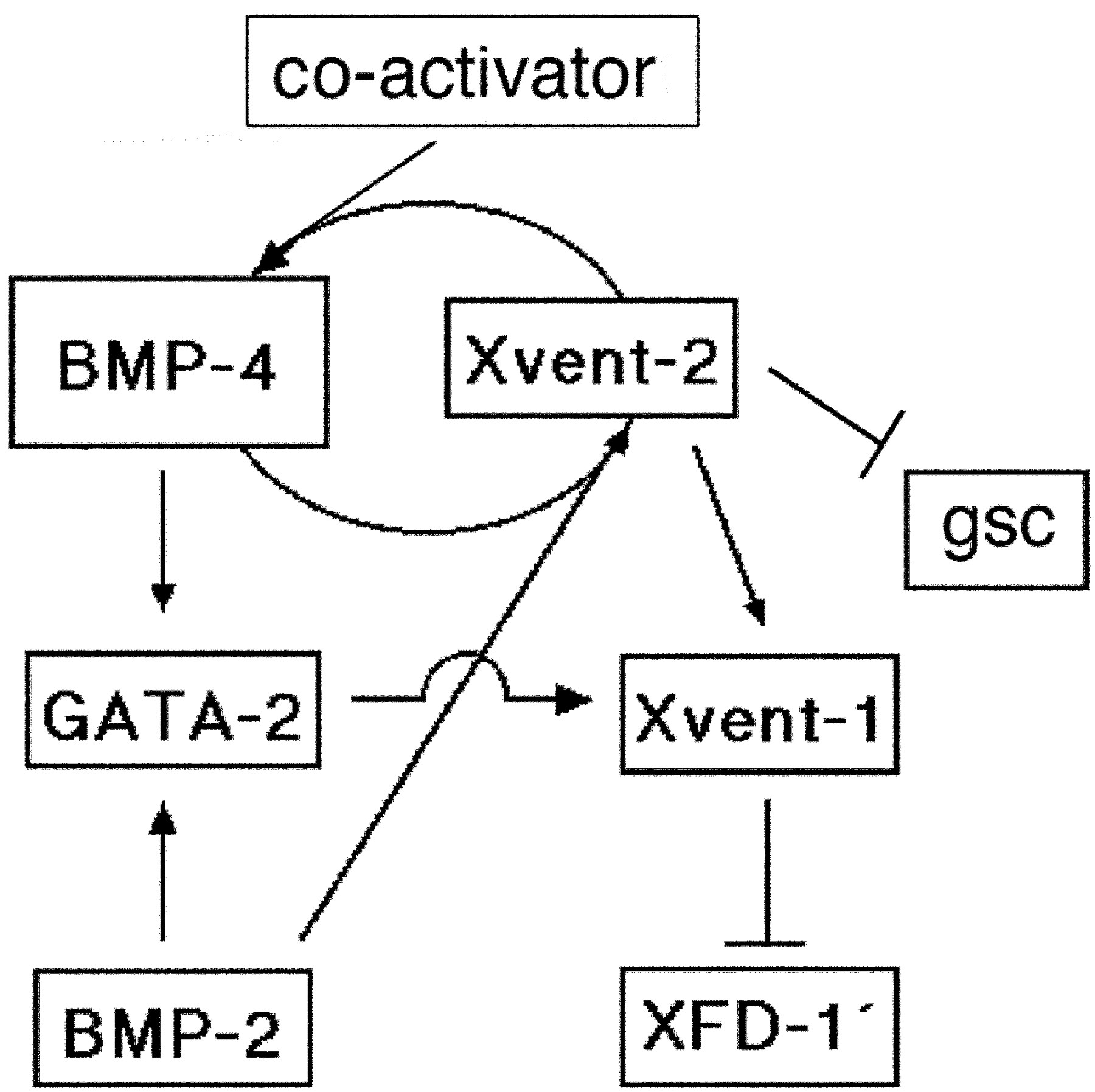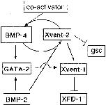 Genetic cascades involved in the activation and autocatalytic regulation of BMP-4. While BMP-4 activatesXvent-2 and GATA-2, only Xvent-2 is able to up-regulate BMP-4. BMP-2 protein translated from maternal RNA activates Xvent-2 and triggers the autocatalytic loop, which is subsequently maintained by BMP-4 and Xvent-2 recruiting a yet unknown co-activator. Xvent-2 suppresses gsc. GATA-2 and Xvent-2 activate Xvent-1 which has been shown to repress ventral expression of the dorsal lip-specific winged helix geneXFD-1′ (12, 24, 31, 47). |