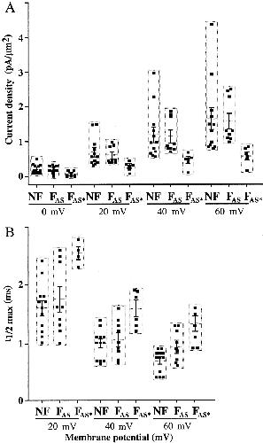 Properties of I Kv in FAS* neurons. Currents were recorded at 18–22 hr in culture. A, Current densities of FAS*neurons are reduced relative to those of NF and FASneurons. FAS* cells show a mean 62 ± 1% decrease in current density at 0 to +60 mV (p < 0.01), whereas FAS cells have currents that are not different from NF controls. The boxes include all measurements from cells at a particular voltage. Horizontal bars indicate the means for these measurements, and vertical barsindicate SEMs. NF, Nonfluorescent;F AS, fluorescent, but unaffected by AS;F AS*, fluorescent, affected by AS. Values were designated FAS* when they exceeded 2 SD from the mean values for NF neurons in the same culture dishand thus in some cases overlap the values for NF neurons recorded in other cultures; n = 27. B, Times to half-activation (t 1/2max) of FAS* neurons are increased relative to those of NF and FAS neurons. FAS* cells show a 66 ± 6% increase in t 1/2max at +20 to +60 mV (p < 0.01), whereas FAS cells have currents that are not different from NF controls. Values at 0 mV are not shown because I Kv is small and slowly activating at this potential in FAS* neurons, and discrimination from noise is ambiguous; n = 27. Noise precluded measurement from two cells at +20 mV. |